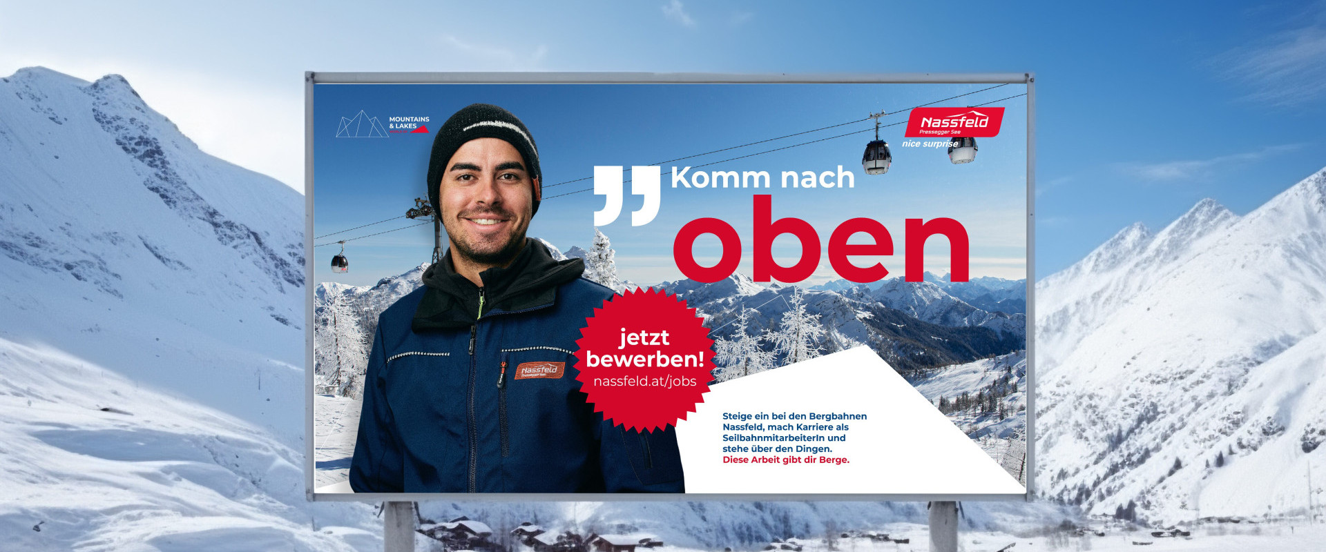 Um professionell digital agieren zu können braucht es eine Reihe von Basics, die wenn nicht vorhanden, geschaffen werden müssen, bevor die ersten Employer-Branding-Kampagnen lanciert werden können. „Wir haben Social Media Kanäle etabliert, einen entsprechenden Mitarbeiter-Bereich inklusive einfacher Bewerbungsmöglichkeit im Web geschaffen, Landingpages vorbereitet u.v.m. Das hat unseren Auftritt in Richtung Mitarbeiter deutlich verbessert“, berichtet der Nassfelder Seilbahner. „Parallel dazu haben wir uns an die Kreation der Employer-Branding-Kampagne gemacht und die Botschaft ‚Diese Arbeit gibt dir Berge‘ samt spannender Headlines und toller Visuals geschaffen“, blickt Rubikon-Chef Maier zurück.