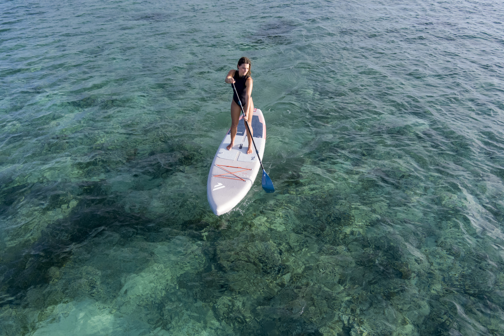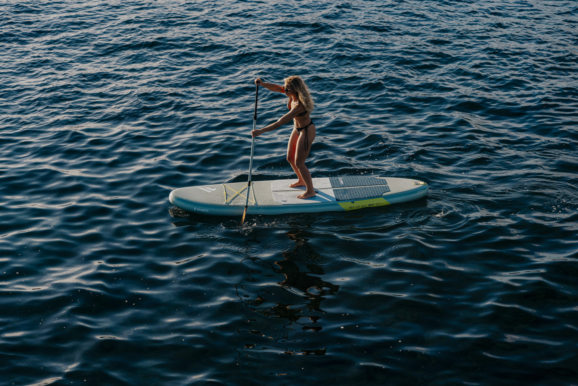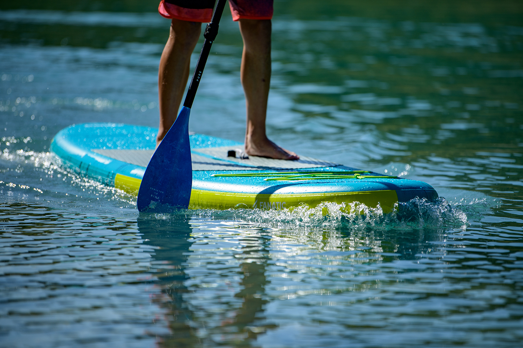 Bei SUPs gibt es enorme Vielfalt und Auswahl. In der Regel werden des praktischen Packmaßes wegen aufblasbare Boards gekauft. Als Einsteiger sollte man ein Set aus Board, Paddel, Pumpe, Leash (elastisches Band, das Boarder und Board verbindet) und Packsack erstehen. „Boards für Einsteiger sind runder und im Heck breiter und dadurch fehlerverzeihender. Für Fortgeschrittene, die länger und schneller unterwegs sein wollen, sind gepfeilte, langgezogene, etwas schmälere Boards ratsam“, erläutert Produkt-Experte Sammer. Durchdacht und qualitätsmäßig top, auch was das Zubehör im Set betrifft, sind die Packages von Fanatic.