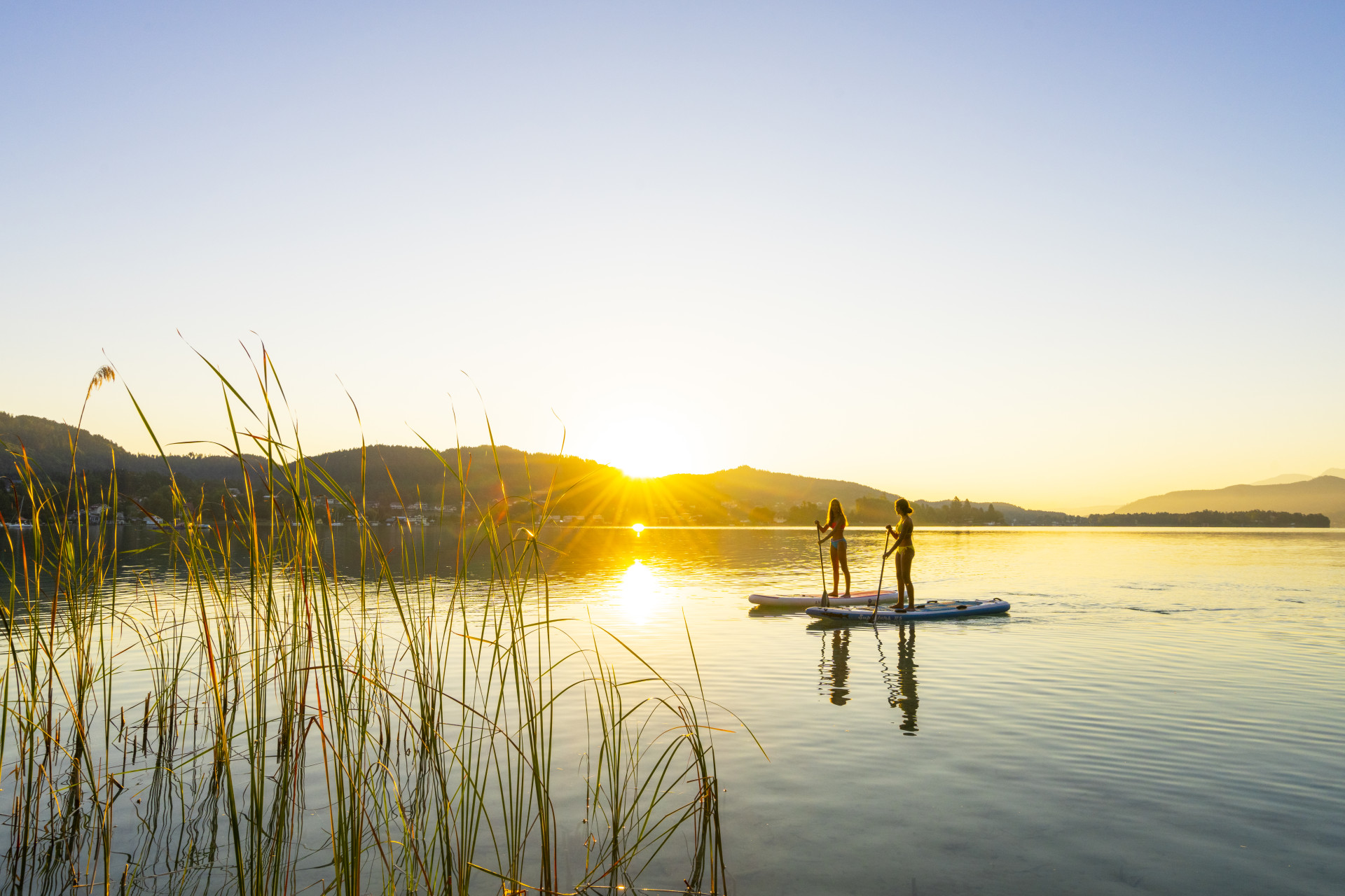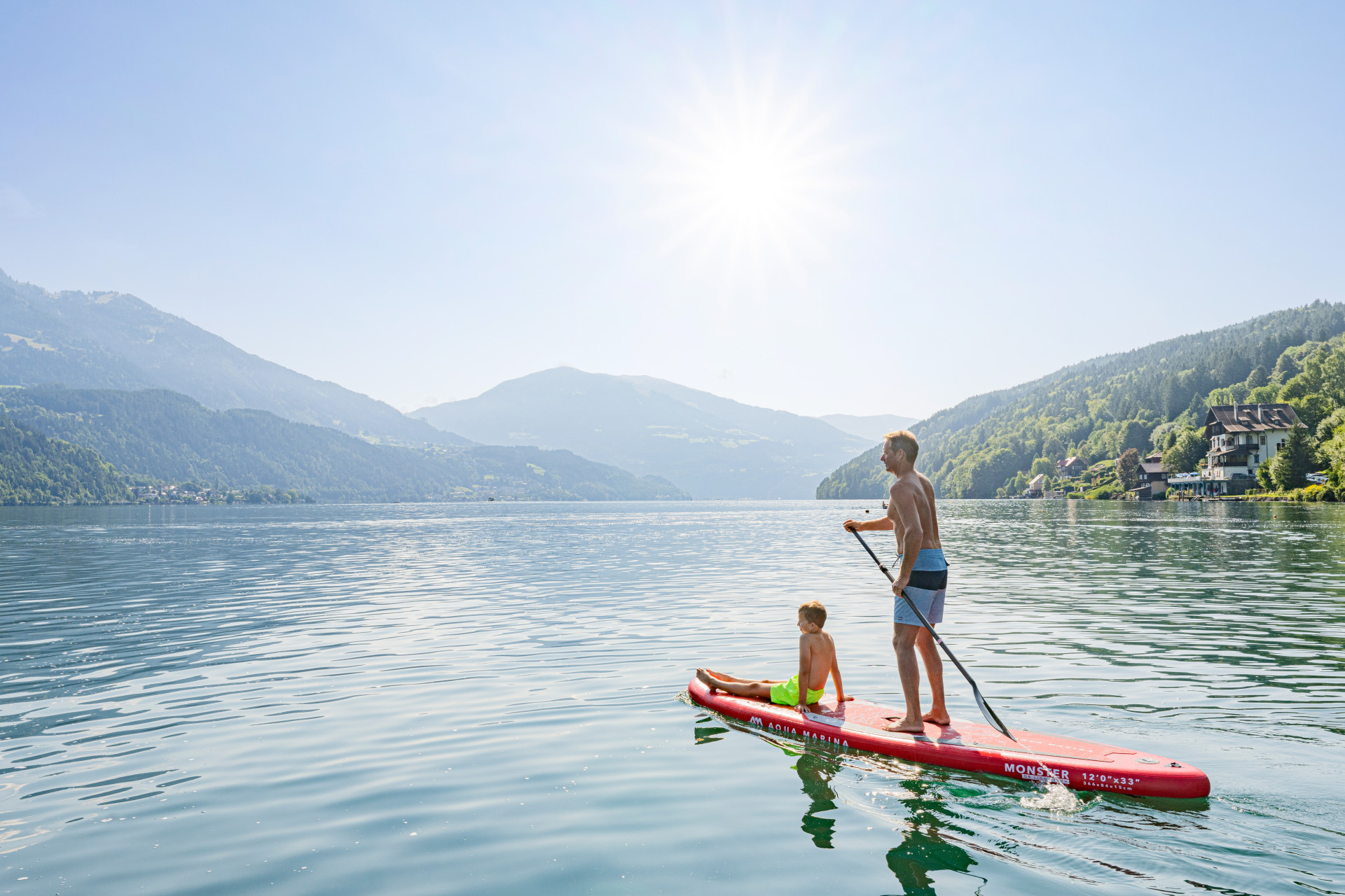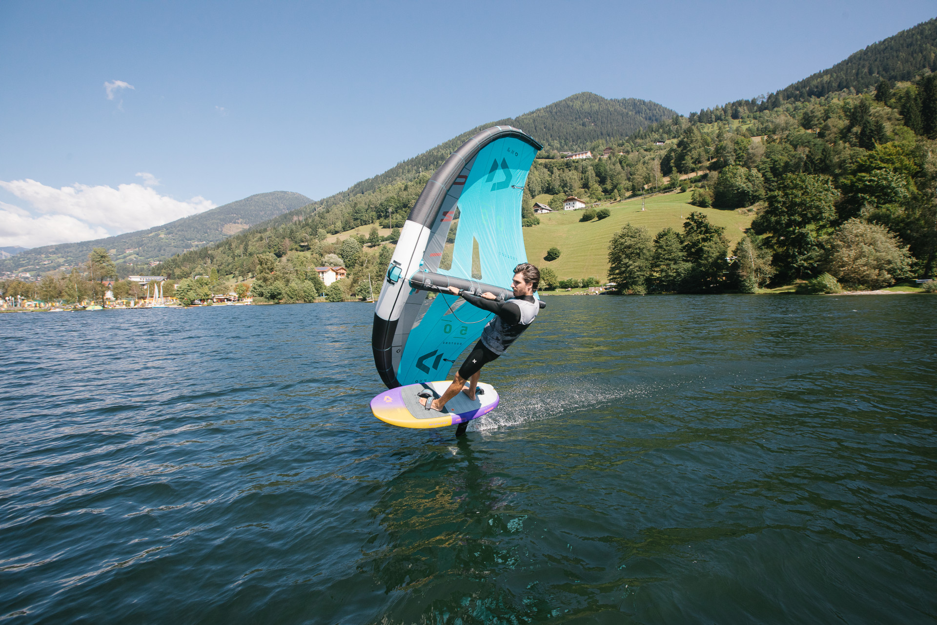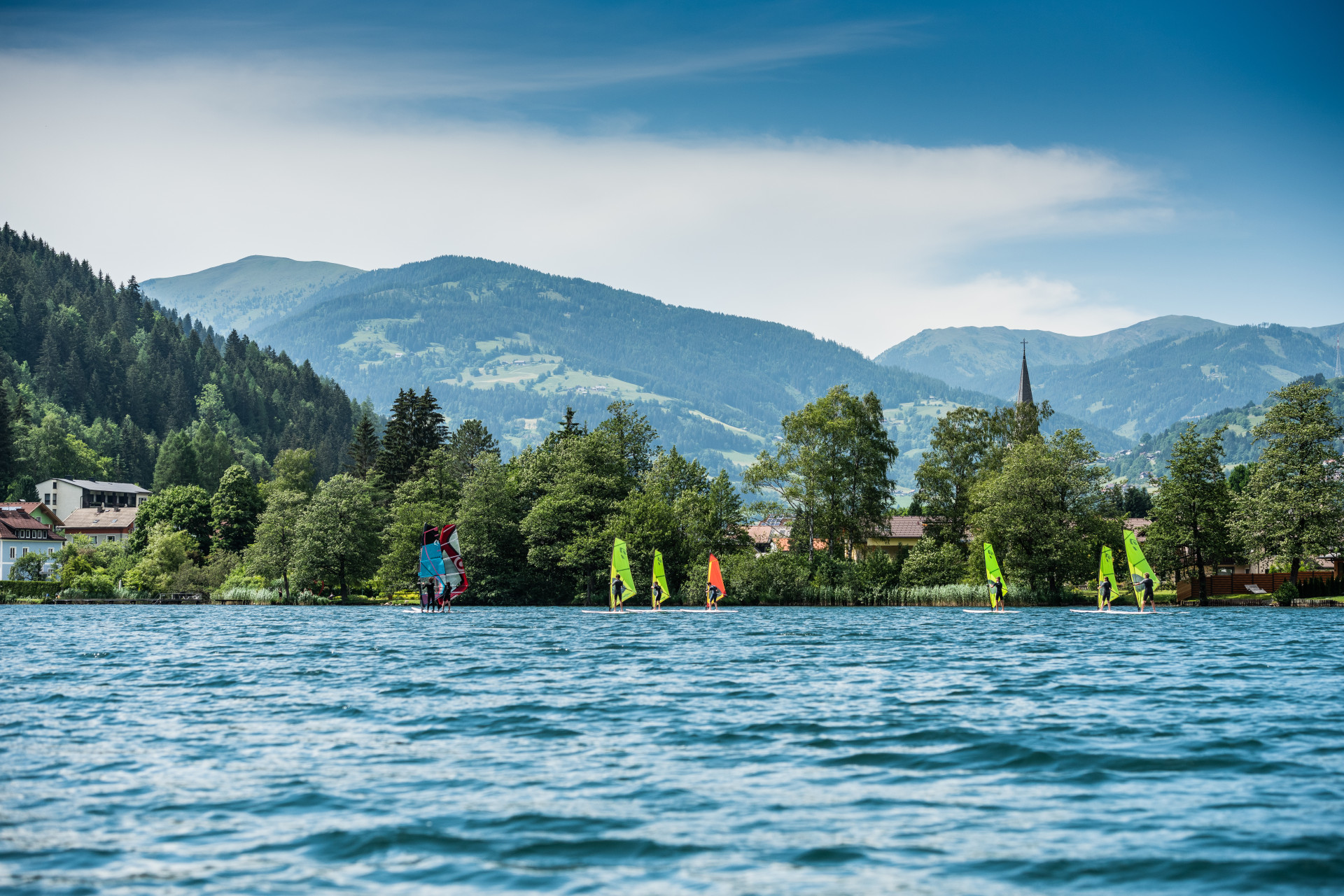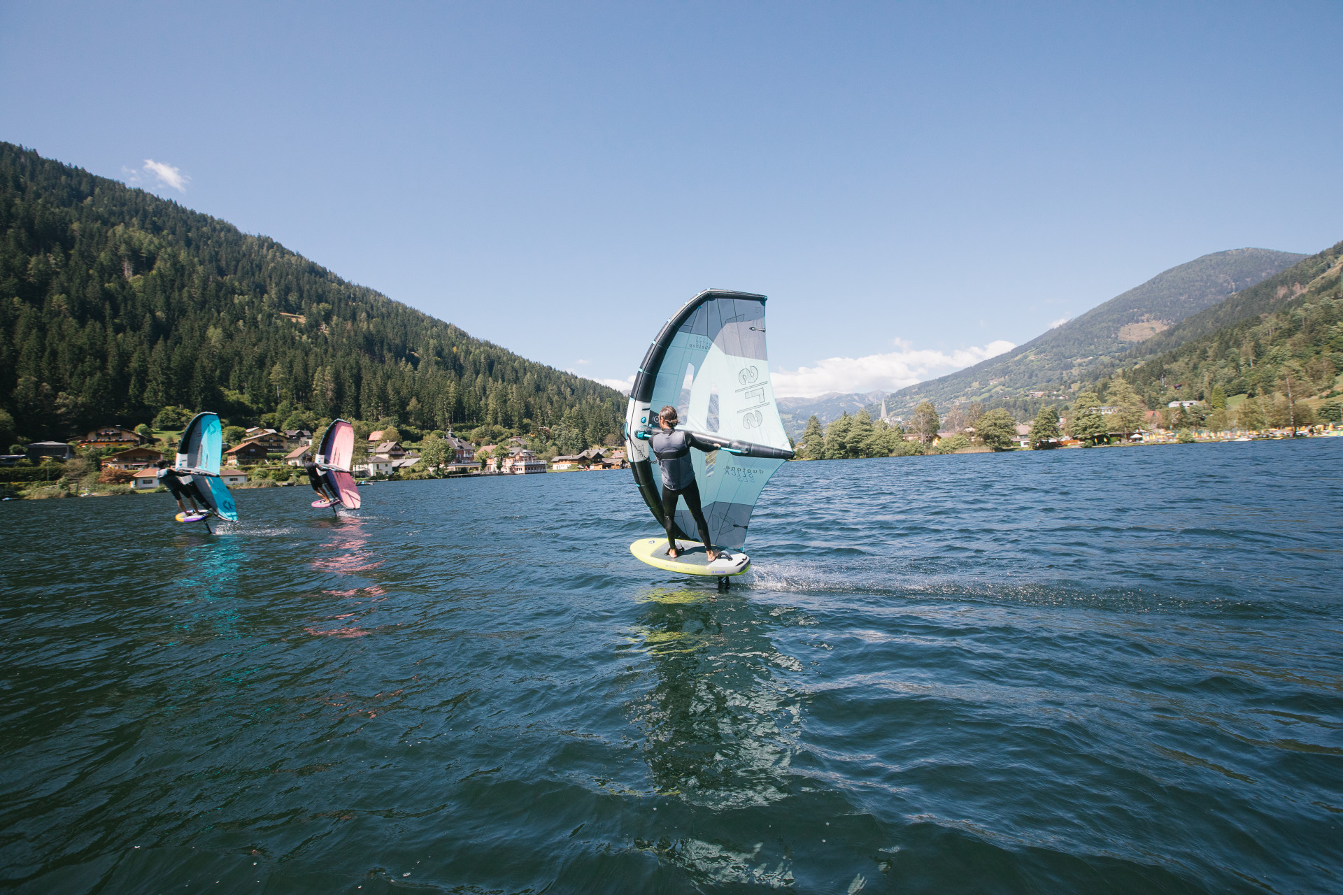 Es ist ein Gefühl von Freiheit, das ich beim Surfen und Segeln draußen am Wasser genieße. Mit Wind und Wellen zu spielen, manchmal auch zu kämpfen, fasziniert mich sehr“, erklärt Wolfgang Krainer, Seniorchef der gleichnamigen Sportschule in Feld am See. „Die beste Möglichkeit für mich nach einem intensiven Tag herunter zu kommen, ist zu surfen oder zu segeln“, schwärmt Krainer. Wer hinaus aufs Wasser will, kann neben Segeln und Surfen zwischen weiteren Sportarten wählen. Stand-Up-Paddeln (SUP) kann gemütlich aber auch sportlich betrieben werden. Es gibt sogar Staatsmeisterschaften. „Wing Foiling ist recht neu. Dabei steht man mit einem Schirm (Wing) in den Händen auf einem Board und gleitet schon bei mäßigem Wind auf dem Hydro-Foil genannten Flügel unterhalb des Boards übers Wasser“, erklärt Adrian Krainer. Der ehemalige Profi-Snowboarder leitet mit seiner Schwester Vanessa die von ihren Eltern gegründete Sportschule. Das spektakuläre Wing Foiling hat, so Adrian Krainer, „den Vorteil, dass es einfacher auszuüben ist als es aussieht. Es ist auch leichter zu erlernen als klassisches Surfen. Schon nach wenigen Kursstunden kann man alleine loslegen.“